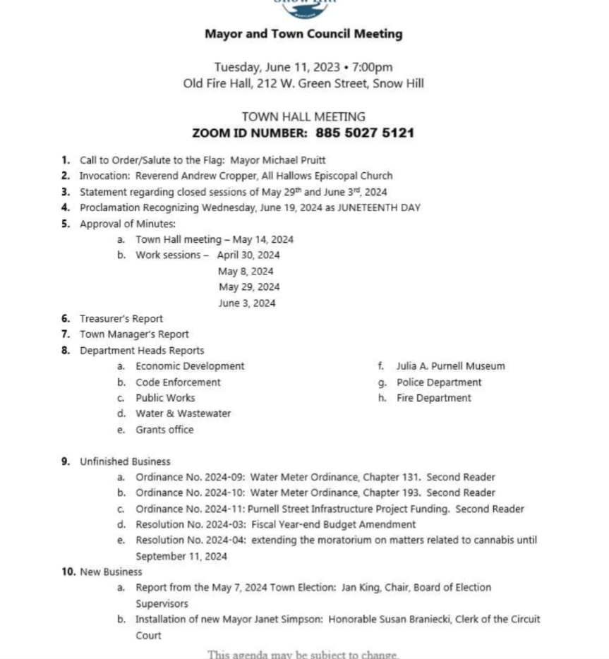 There is an opportunity for Public comment at the end of the meeting, and it will be broadcast via Zoom (ID# 885 5027 5121) as well as on Facebook Live via the What’s Happening in Snow Hill page.