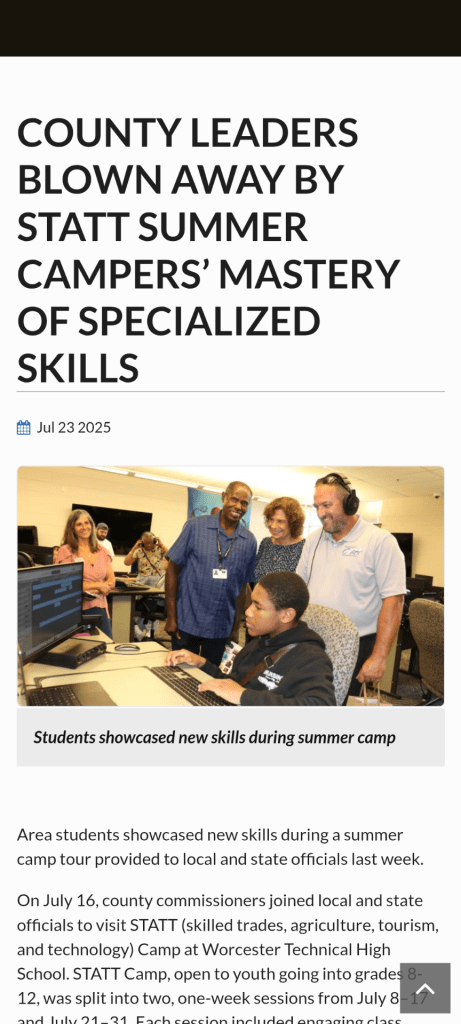 Summer STATT Program for High School Students Impress Visiting Local and State Leaders Posted byLower Shore ObserverJuly 28, 2025July 26, 2025Posted inEducation, Worcester CountyTags:high school, STATT, students, Worcester County Read the full article: https://www.co.worcester.md.us/news/county-leaders-blown-away-statt-summer-campers-mastery-specialized-skills Share this: Click to share on X (Opens in new window) X Click to share on Facebook (Opens in new window) Facebook Like Loading... Related